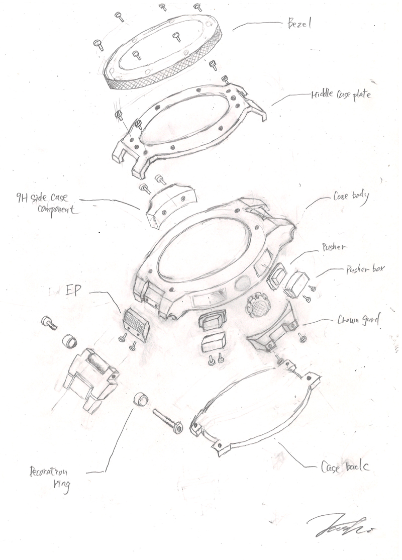 ケース本体を分割可能なバラバラのパーツで構成して、ネジでそれを組み立てることが出来るというものです。そして、個々のパーツを異素材や異なる表面処理の色で作ることで、それぞれを自由にカスタムすることが出来るというコンセプトでした。