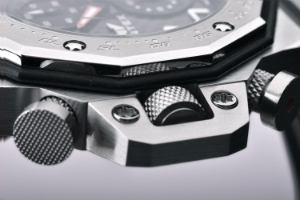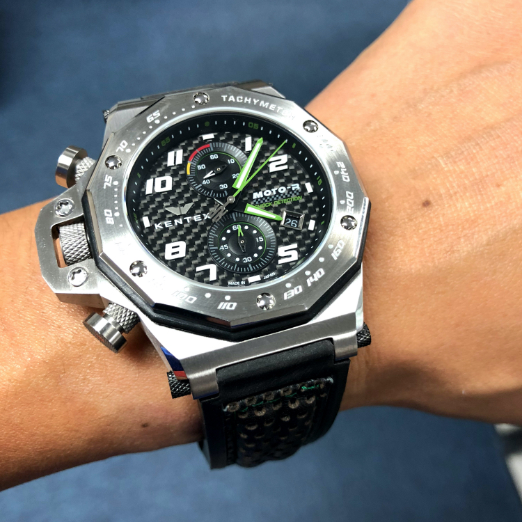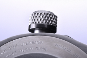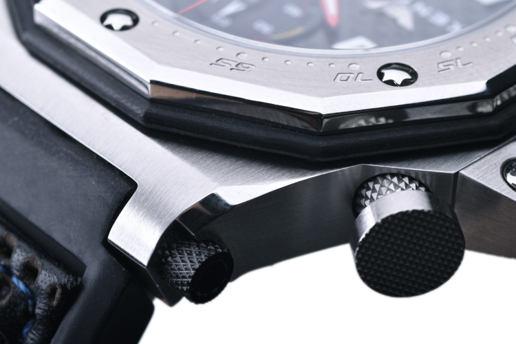 また、リューズやプッシャーには、バイクのバックステップから着想を得た細かなダイヤパターンが刻まれ、バイクらしいデザインでボタン使用時の操作性に配慮した作りとなっています。