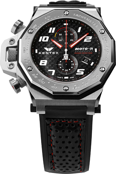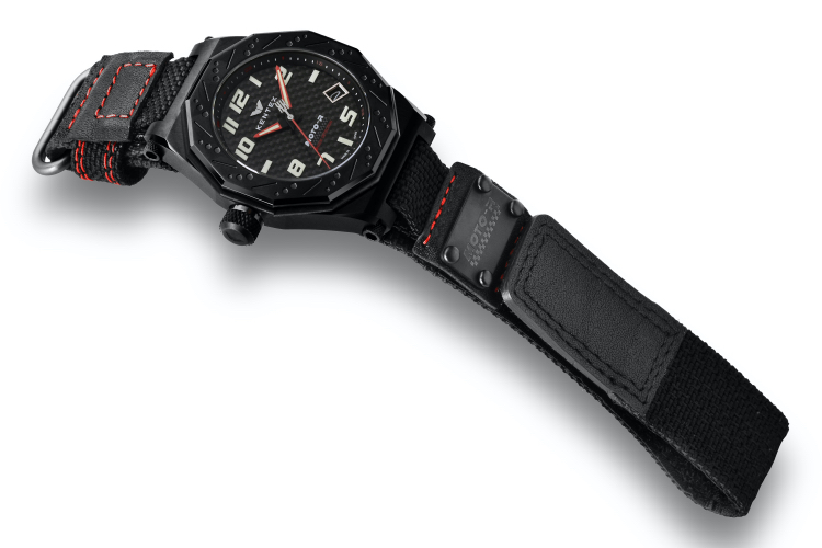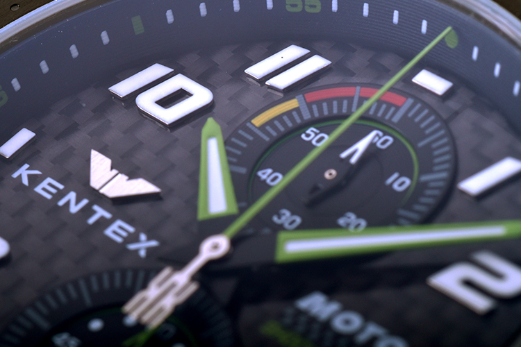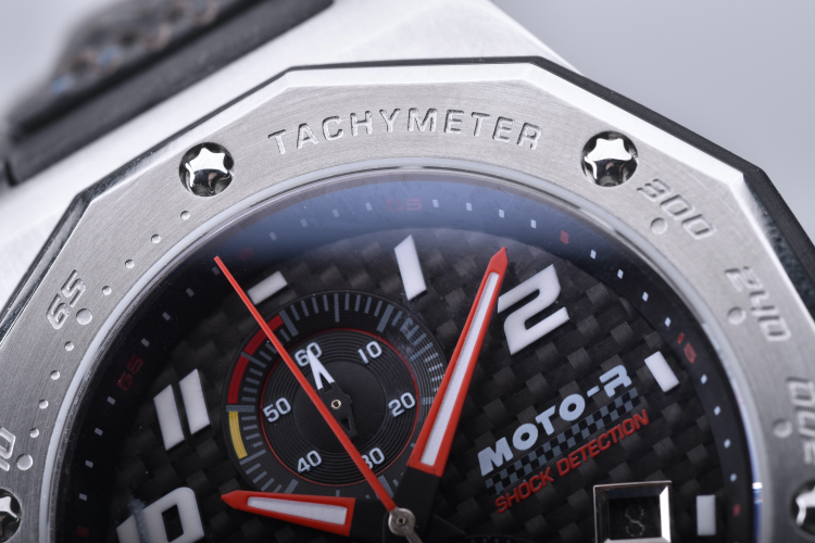 ベゼルにはブレーキディスクを思わせる精密なエッチングパターン(3針モデル)と、速度計算が可能なタキメーター目盛り(クロノモデル)が刻印され、ライダーウォッチに相応しい個性的な外装デザインが完成しました。