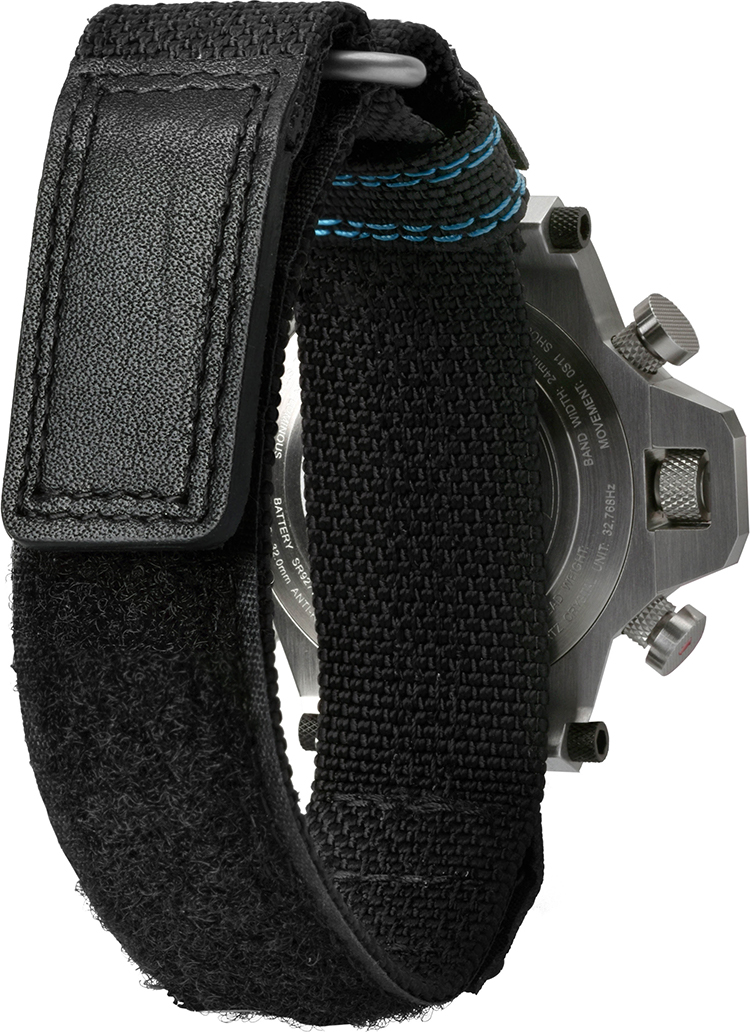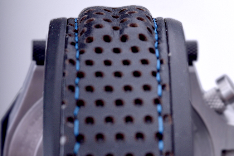 ベルトは、汗にも強く、長時間着けても肌に優しいソフトラバー材をベースに、外側にパッド入りのパンチングレザーを縫いつける2層構造で、ライダーウォッチに相応しいこだわりのデザインとなっています。