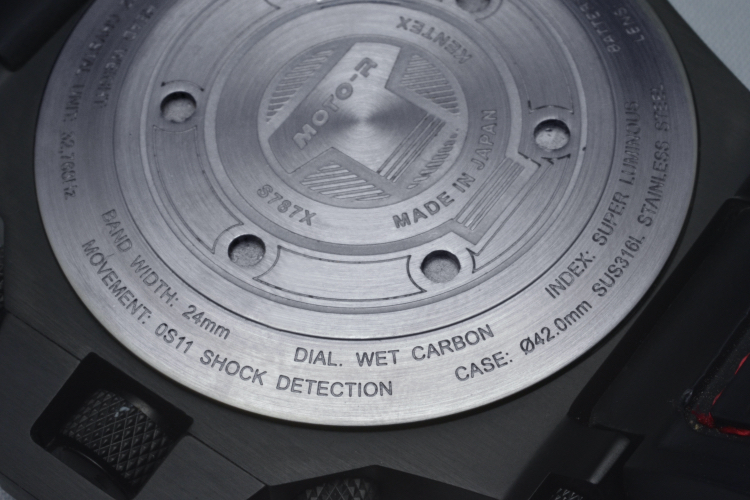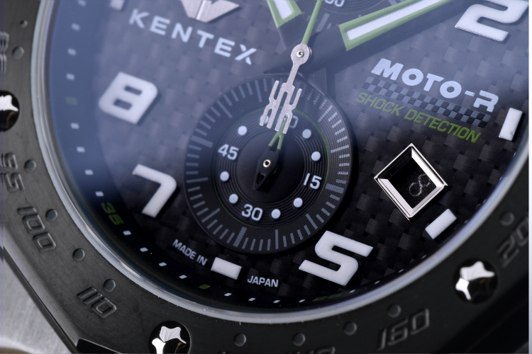 ライダーウォッチに相応しいこの“ショックディテクション”(衝撃感知)システムは、その機能の証として、時計の文字盤にも印字されています。